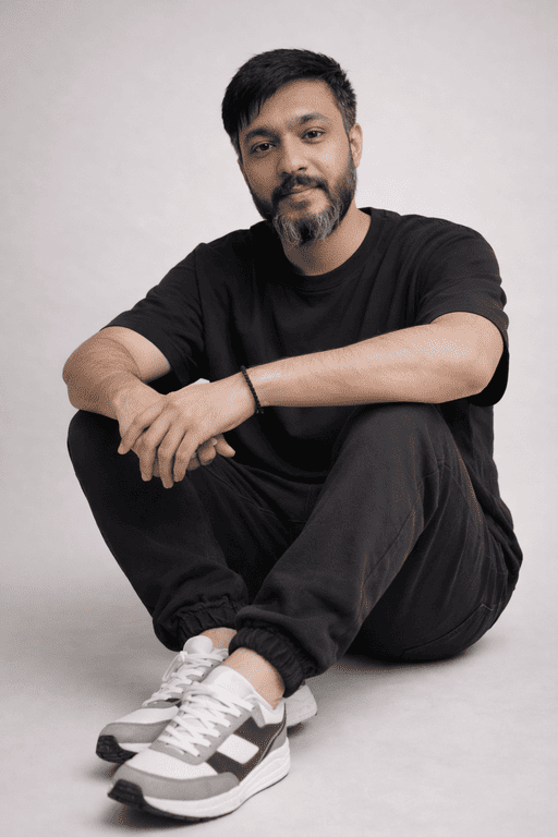 Use the attached photo as the ONLY and EXACT facial identity reference. Facial identity must remain 100% unchanged. ❌ No beautification ❌ No face morphing ❌ No skin smoothing ❌ No stylization of facial features ❌ No changes to eyes, nose, lips, jawline, head shape, skin tone, age, or expression If any conflict occurs, facial accuracy overrides lighting, pose, realism, or style. The man sits on the studio floor with one knee up and the other leg folded, elbows resting loosely on the raised knee. He wears a black oversized t-shirt, charcoal joggers, and modern sneakers. Accessories are minimal—perhaps a simple bracelet or watch. Background is a neutral off-white or light grey backdrop. Lighting is soft but slightly contrasty for a modern street look. Photography style: contemporary lifestyle / streetwear editorial, sharp focus, realistic textures.
