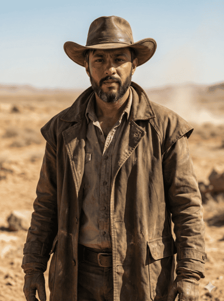 Create a rugged desert gunslinger standing in a sun-scorched western landscape. He wears a weathered leather cowboy hat with visible cracks, a dusty brown duster coat, a faded cotton shirt, leather gloves, and worn boots. His clothing shows signs of long travel—dust buildup, creases, and texture wear. Harsh desert sunlight hits from the side, creating dramatic shadows across the environment while keeping the face natural and untouched. Background shows dry land, rocks, and distant heat haze. Ultra-realistic textures, cinematic color grading, shallow depth of field, intense western storytelling mood, 8K photorealistic quality.