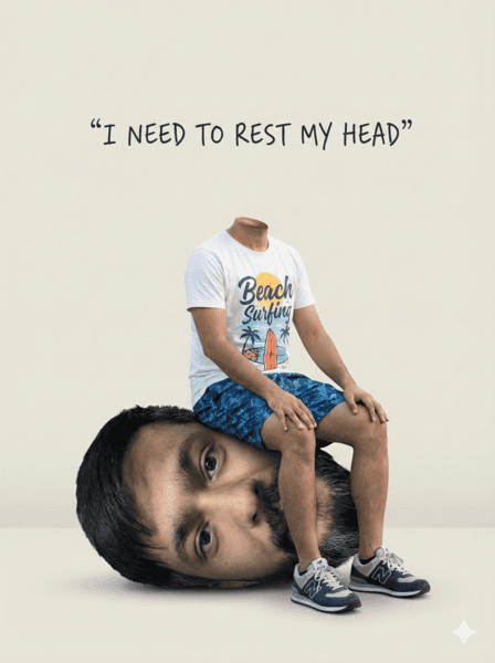 A surreal conceptual artwork depicting a headless person sitting on their own oversized detached head, which is lying sideways on the ground. The person wears a white t-shirt, similar half pant like this image, and New Balance sneakers, sitting calmly with hands resting on their knees. The background is minimalistic and pale, giving a clean, dreamlike atmosphere. Above them, handwritten text reads: “I NEED TO REST MY HEAD”, evoking a metaphor for emotional or mental exhaustion. The lighting is soft and even, enhancing the surreal yet contemplative tone of the scene. The head of man should be similar with this image head without sunglasses. The body should be matched on this body of this image.