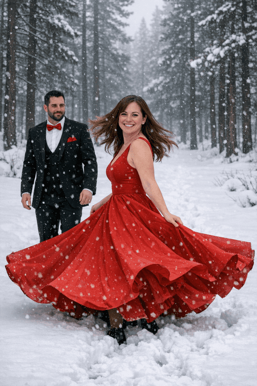 Use the attached couple photos as the ONLY and EXACT facial identity reference. Facial identity must remain 100% unchanged across the entire image. ❌ Do NOT beautify ❌ Do NOT stylize ❌ Do NOT reinterpret ❌ Do NOT smooth skin ❌ Do NOT alter facial structure, skin tone, eyes, nose, lips, jawline, beard, hairline, or expressions ❌ No face morphing, no AI face enhancement Facial accuracy has absolute priority over lighting, pose, angle, realism, or artistic quality. The same exact face from the attached photos must appear in the final output. Create an ultra-realistic cinematic pre-wedding photoshoot set in a snow-covered winter forest. Tall pine trees in the background, slightly foggy atmosphere, gentle snowfall visible in the air. Fresh white snow covers the ground with soft footprints. The female wears a flowing sleeveless deep red gown with a wide circular flare. The dress is captured mid-motion as she twirls gracefully, fabric spreading dramatically. Her hair flows naturally with the motion. Expression must match the attached reference photo exactly. The male walks slightly behind and to the side, wearing a black tuxedo suit, white shirt, black trousers, red bow tie, and red pocket square. Relaxed posture, looking toward the female. Facial features, beard, and expression must remain identical to the reference image. Snowflakes frozen mid-air using a high shutter speed. Soft, diffused winter lighting with no harsh shadows. Minimal color palette — white snow, dark green trees, black suit — with the red gown as the main visual contrast. Camera: professional DSLR look, eye-level angle, medium-wide framing, shallow depth of field. Sharp focus on the couple, softly blurred background. Editorial wedding photography style, cinematic composition, natural skin texture, realistic motion, 4K ultra-high resolution. Aspect Ratio: Vertical 9:16 Mood: Romantic, cinematic, elegant, natural Priority: Facial identity > everything else 🔒 Reinforcement Line (Very Important – Keep This) If any conflict occurs, preserve the exact face from the attached photos and sacrifice lighting, pose, or realism instead.