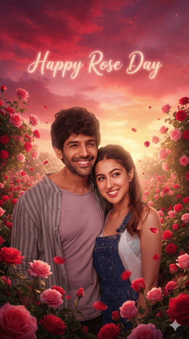 A dreamy Rose Day scene where “Happy Rose Day” is written across the evening sky in soft glowing light. Below, the couple stands among blooming rose bushes. Facial identity remains untouched. Pink-red sky tones, volumetric light, cinematic fantasy realism, ultra-detailed environment.