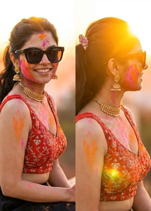 Soft golden sunlight creates a glowing rim light around her hair, with warm orange sky gradients in the background. Gentle wind moves her hair slightly. Colored Holi powder particles float subtly in the air around her, catching the sunlight.