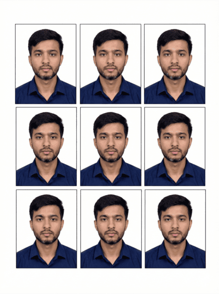 Create Indian-standard passport size photographs suitable for Indian Passport, Aadhaar, PAN Card, Voter ID, Driving Licence, and all Indian government documents, formatted for direct photo-paper printing.