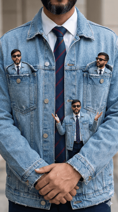 From the large denim jacket pockets, multiple miniature versions of the same man appear: