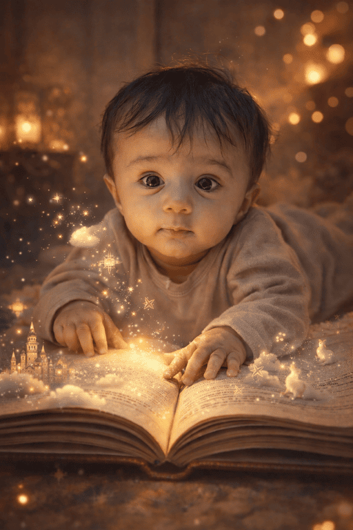 Use the attached baby photo as the ONLY and EXACT facial identity reference, with the baby’s facial features remaining 100% unchanged at all times. Do not apply any beautification, face morphing, smoothing, skin tone alteration, or changes to the eyes, nose, lips, jawline, head shape, age, or expression—facial accuracy has absolute priority over lighting, pose, realism, or creativity. Create a fantasy scene where the baby is lying on an oversized open storybook, awake and curious, gently touching the pages. From the book, illustrated elements come to life, including tiny castles, glowing stars, soft clouds, and small animals floating upward as magical story elements. The environment should feel warm and cozy with golden bedtime lighting, and the baby should be dressed in soft, neutral-colored clothing. The baby’s face must look exactly identical to the attached photo with no stylization or modification. Render the scene in a magical realism style with ultra-detailed textures, cinematic lighting, shallow depth of field, a whimsical fairytale mood, and 8K resolution.