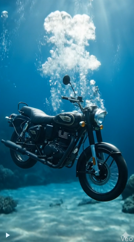 Ultra realistic cinematic underwater shot of Royal enfield Bullet using the reference image.