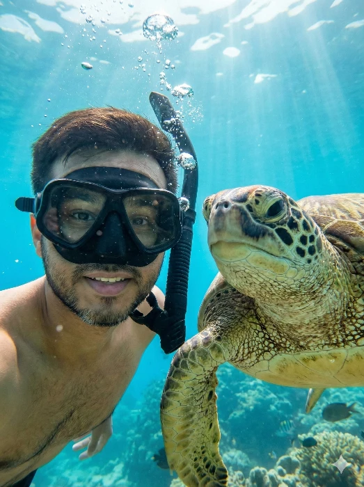 Ultra-realistic underwater selfie of a young man wearing a black diving mask and snorkel, A large green sea turtle swims calmly beside him, close to the lens. Clear tropical blue water, sun rays piercing through the surface, realistic bubbles, natural skin tones, detailed turtle shell texture, slight underwater distortion, 4K DSLR quality, cinematic lighting, shallow depth of field.