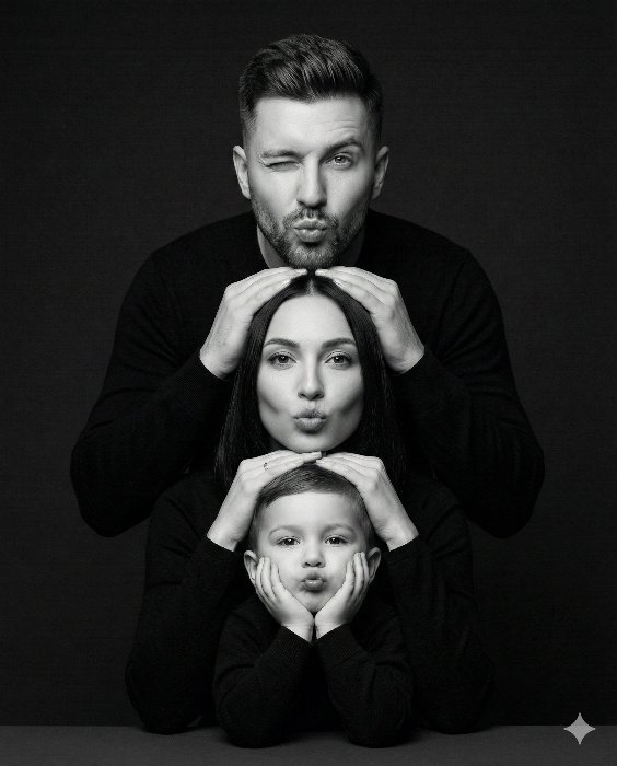 Middle: Adult woman with straight dark hair, wearing a black outfit. She is making a kiss expression toward the camera. Her hands are placed symmetrically on the child’s head below.